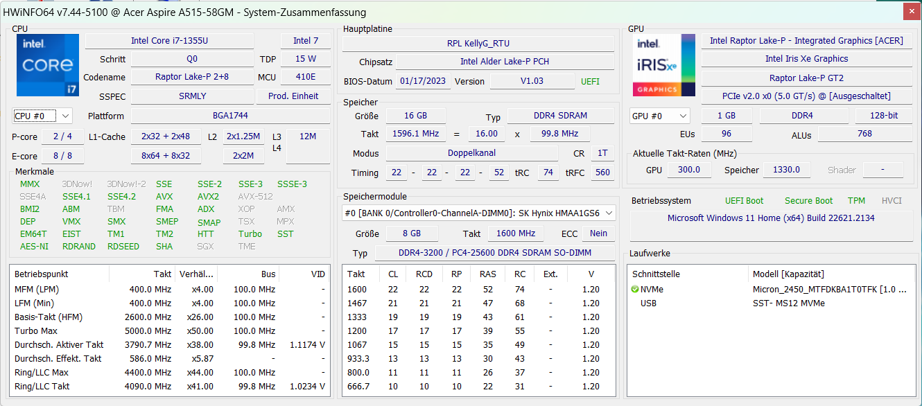 - پردازنده: Intel Core i7-1355U (نسل سیزدهم Raptor Lake)، با ۲ هستهٔ پرقدرت و ۸ هسته کم مصرف