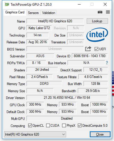 مقایسهی نرخ فریم در بازی Witcher 3 (با تنظیمات پایین) نشان میدهد که مدل GV0101T حتی حدود 2 فریم بر ثانیه عقبتر است که این نیز در محدودهی خطای اندازهگیری است. احتمال دارد که بخش CPU در i7 کمی بالاتر کلاک شود و در نتیجه، توان حرارتی (TDP) بیشتری به خود اختصاص داده و باعث شود بخش گرافیکی HD 620 در i7 به کلاک حداکثری نسخهی i5 نرسد.