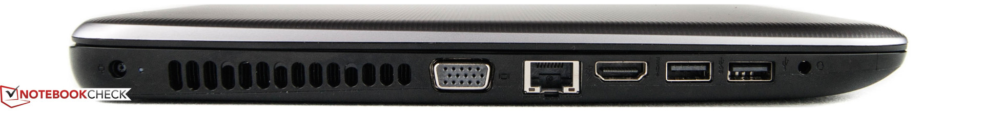 - سمت چپ: پورت شارژ، VGA، پورت Fast Ethernet، پورت HDMI، پورت USB 3.0 (Type-A)، پورت USB 2.0 (Type-A)، جک ترکیبی صدا