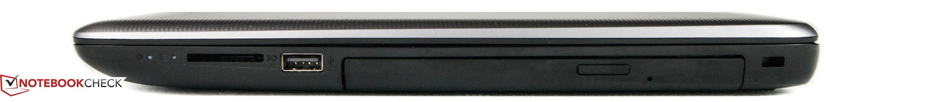 - سمت راست: شکاف کارت حافظه SD، پورت USB 2.0 (Type-A)، درایو نوری، قفل Kensington