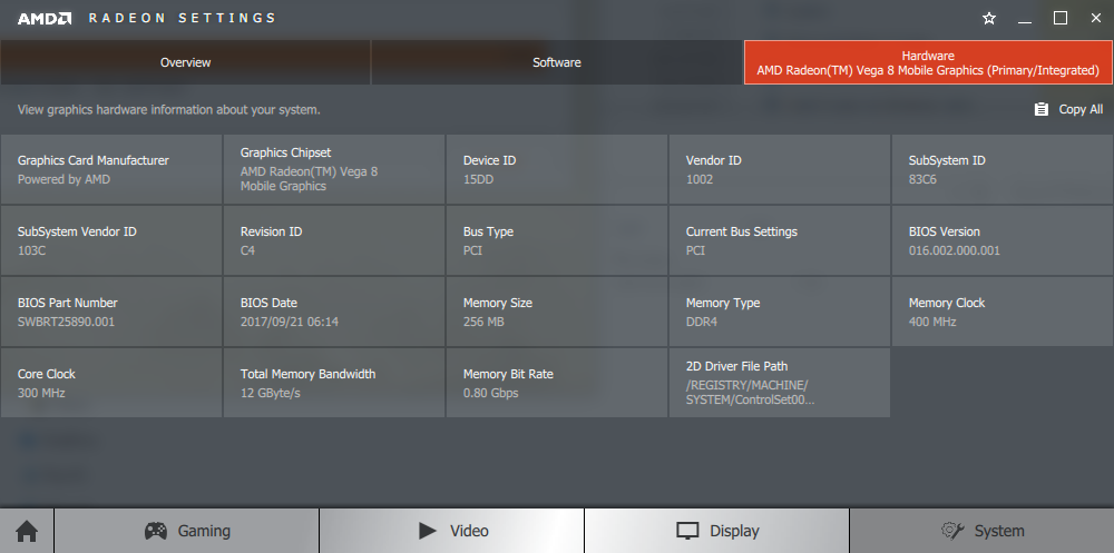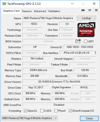 - کارت گرافیک: AMD Radeon RX Vega 8، ۲۵۶ مگابایت VRAM، حافظه DDR4