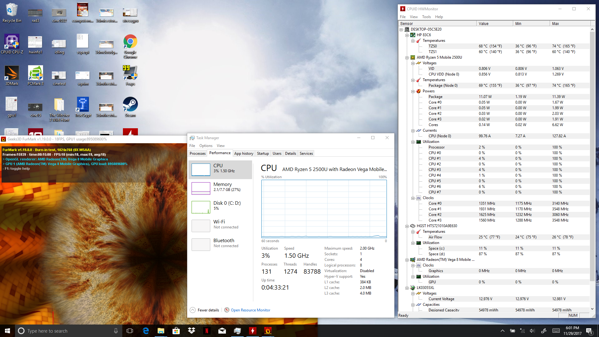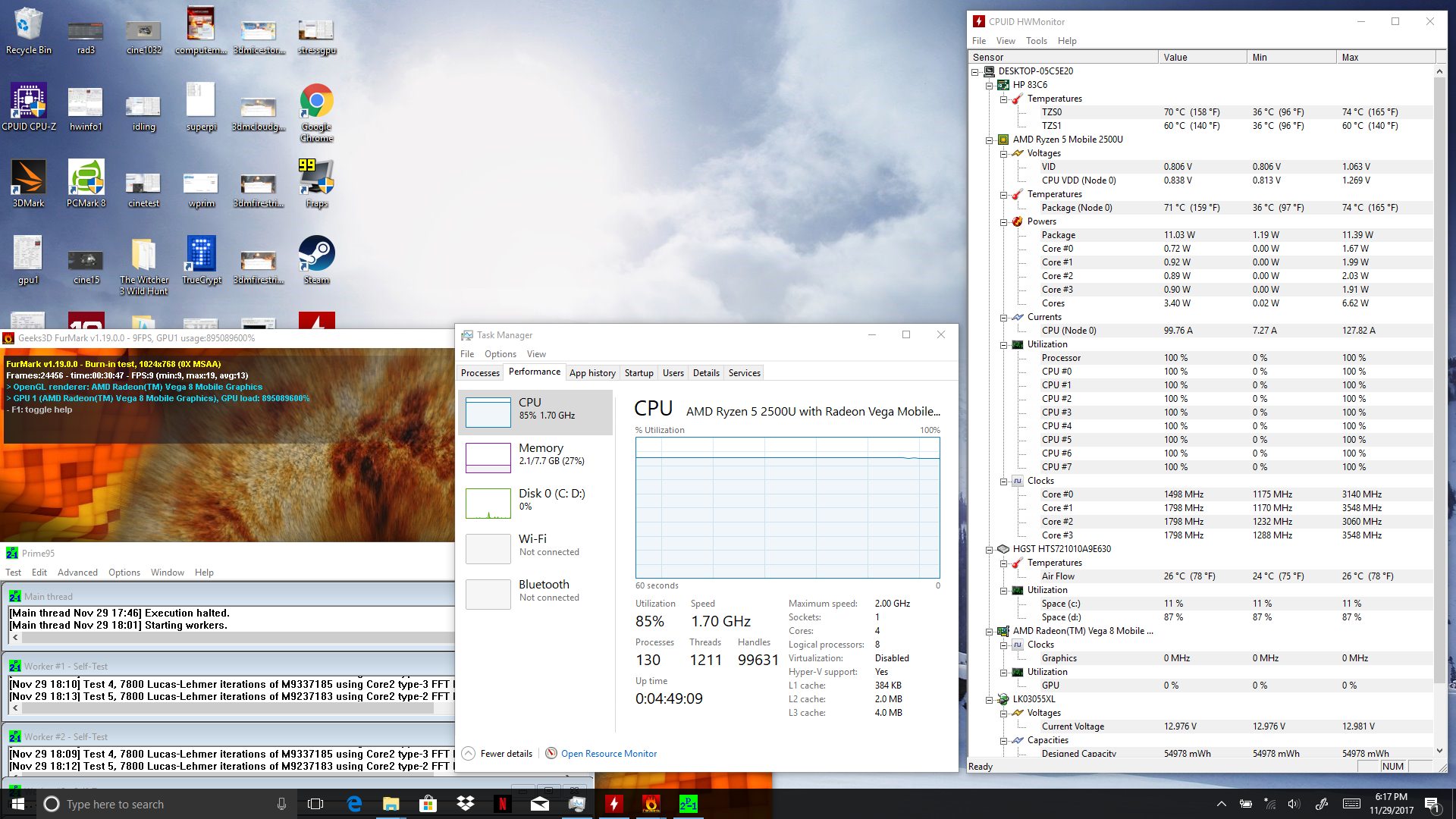 ✔ اجرای همزمان Prime95 و FurMark باعث شد که سرعت پردازنده به محدوده 1.5 تا 1.8 گیگاهرتز کاهش یابد، در حالی که دمای هسته در محدوده پایین 70 درجه سانتیگراد باقی ماند.
