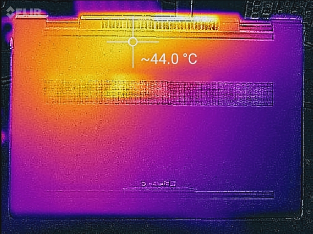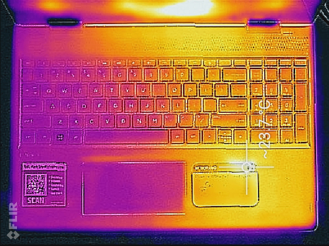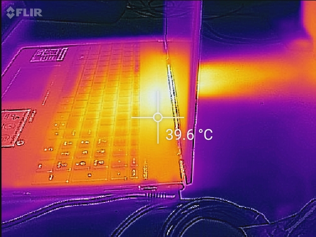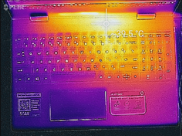 ✔ در هنگام حداکثر بار (Prime95 + FurMark)، نقطهی داغی با دمای 40 درجه سانتیگراد در بالای ردیف اول کلیدهای کیبورد ایجاد میشود. با این حال، این ناحیه جایی نیست که کاربران اغلب لمس کنند.