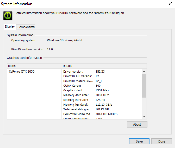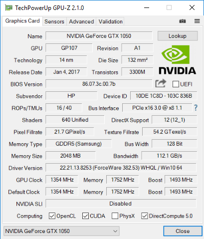 - کارت گرافیک: NVIDIA GeForce GTX 1050 Mobile با 2048 مگابایت حافظه گرافیکی VRAM، فرکانس هسته: 1354 MHz، فرکانس RAM: 7008 MHz، GDDR5، با فناوری Optimus