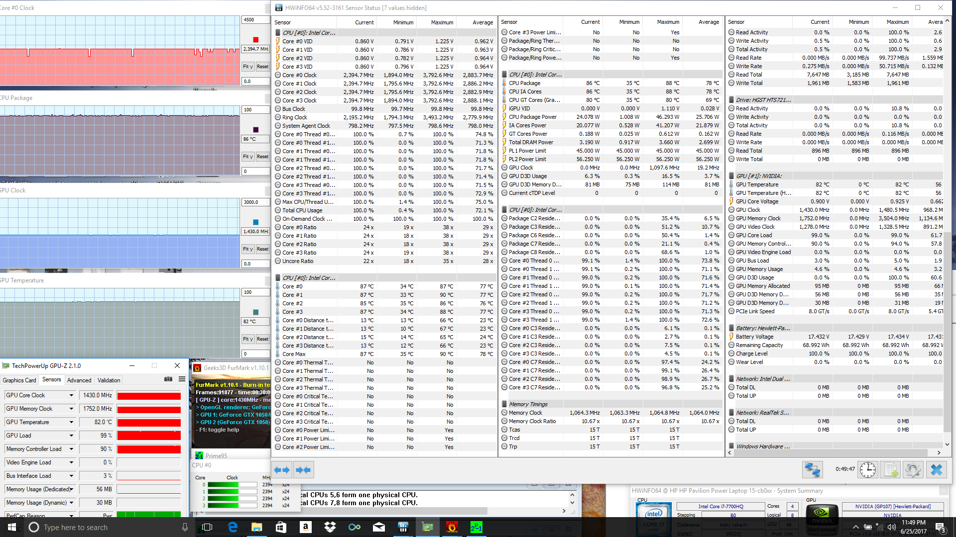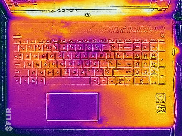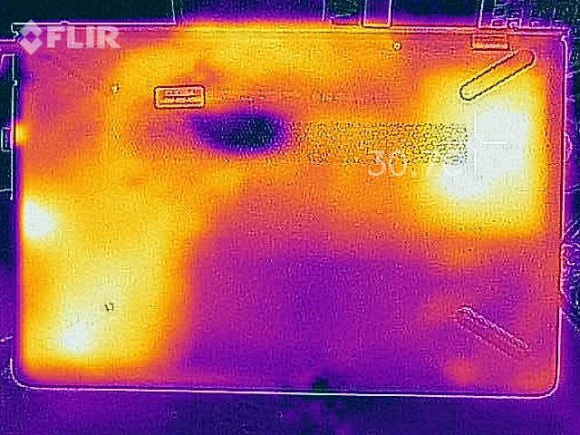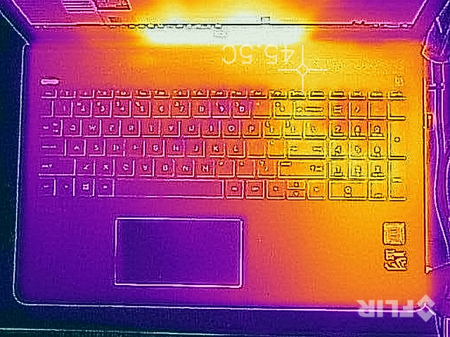 دمای سطحی در هنگام استفاده بیکار ثابت است و قسمت زیرین به طور کمی از قسمت بالایی گرمتر است. در بار کامل با فعال بودن Prime95 و FurMark، سمت راست نوتبوک به طور قابل توجهی گرمتر از سمت چپ خواهد شد به دلیل موقعیت پردازندهها و SSD M.2. این توسعه دمای سطحی نامتوازن باعث میشود که کلیدهای WASD برای بازی نسبتاً خنک باقی بمانند، اما دست راست هنگام تایپ گرما بیشتری نسبت به دست چپ احساس خواهد کرد.