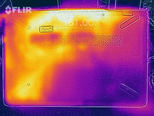 علاوه بر این، جالب است که توجه کنیم که گرما به سمت بالا و به سمت جلوی صفحه نمایش تخلیه میشود، برخلاف بسیاری از نوتبوکها که مشبکهای تهویه معمولاً در لبهها یا پشت قرار دارند. به همین دلیل، سطح صفحه نمایش به شدت گرم خواهد شد، همانطور که در نقشههای دمایی زیر نشان داده شده است. دماهای سطحی میتوانند به 60 درجه سانتیگراد در قسمت زیرین نوتبوک، نزدیک به مشبکهای تهویه برسند.