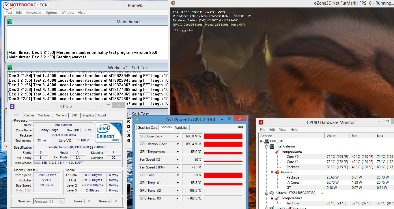 در طول تست استرس (Prime 95 و Furmark که حداقل به مدت یک ساعت اجرا میشوند)، پردازنده و کارت گرافیک با حداکثر توان در برق مستقیم کار میکنند. در حالی که سرعت پردازنده در حالت باتری کاهش نمییابد، فرکانس کارت گرافیک به 400 مگاهرتز کاهش مییابد و دمای پردازنده به 80 درجه سلسیوس میرسد.