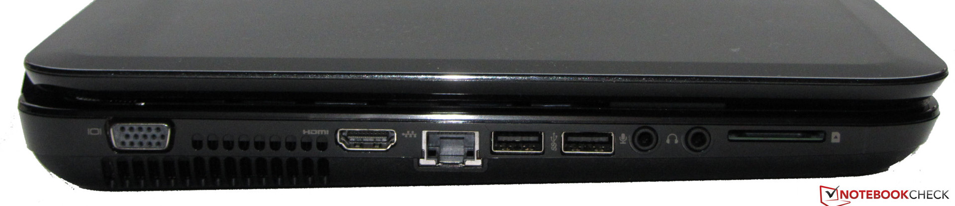 سمت چپ: VGA، HDMI، اترنت، ۲x USB 3.0، میکروفون، هدفون، خواننده کارت (SD و MMC)
