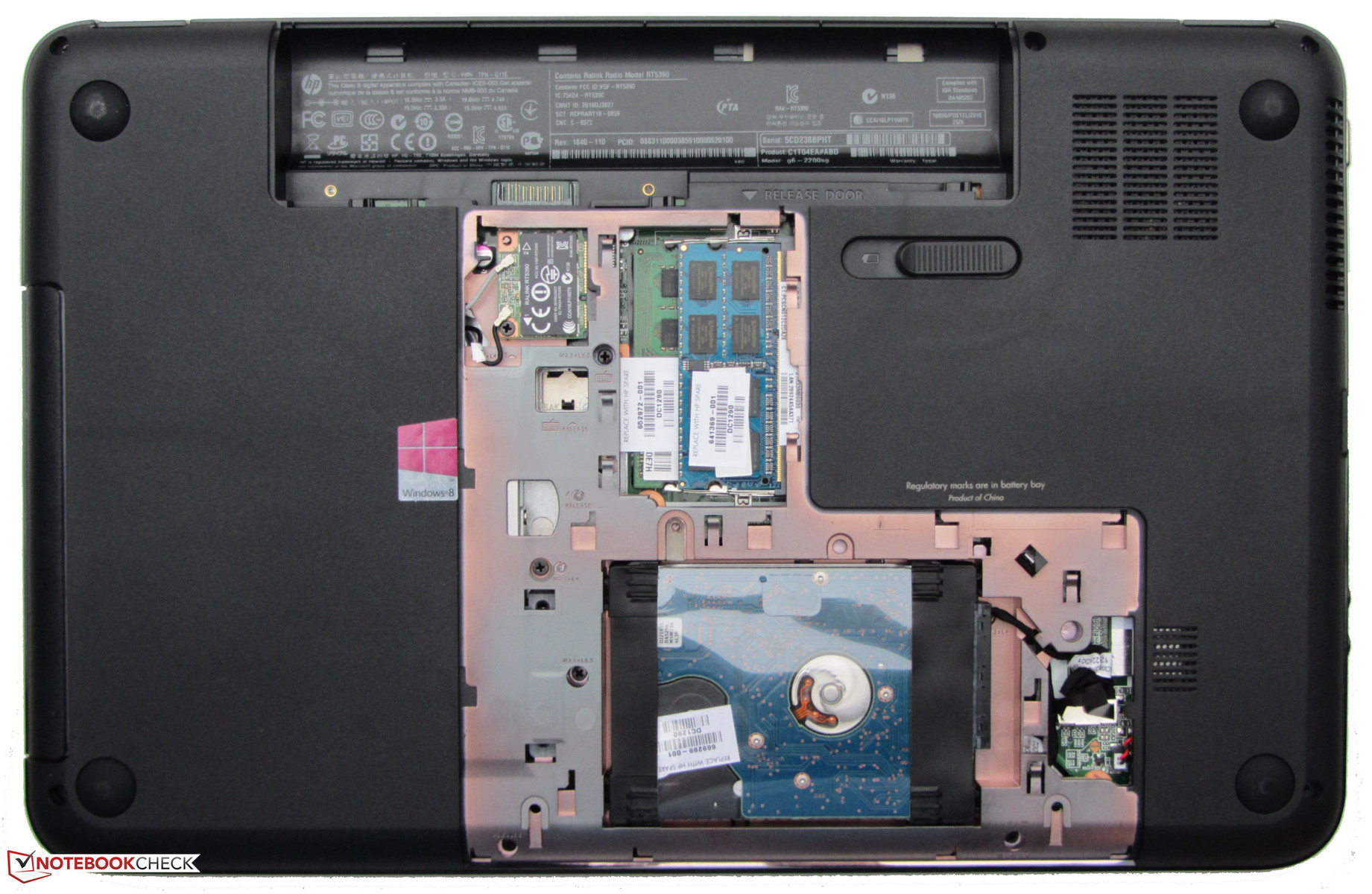 رم، هارد دیسک و ماژول WiFi پشت یک دریچه سرویس مخفی شدهاند. با این حال، دسترسی به فن امکانپذیر نیست. Pavilion دو شیار رم دارد و از حداکثر ۸ گیگابایت رم پشتیبانی میکند و بهطور استاندارد با ۶ گیگابایت رم عرضه میشود. هارد دیسک را میتوان در چند مرحله تعویض کرد. باید توجه داشت که HP از هارد دیسکی استفاده میکند که ارتفاع آن ۷ میلیمتر است، در حالی که هارد دیسکهای معمولی ضخامت ۹.۵ میلیمتر دارند.