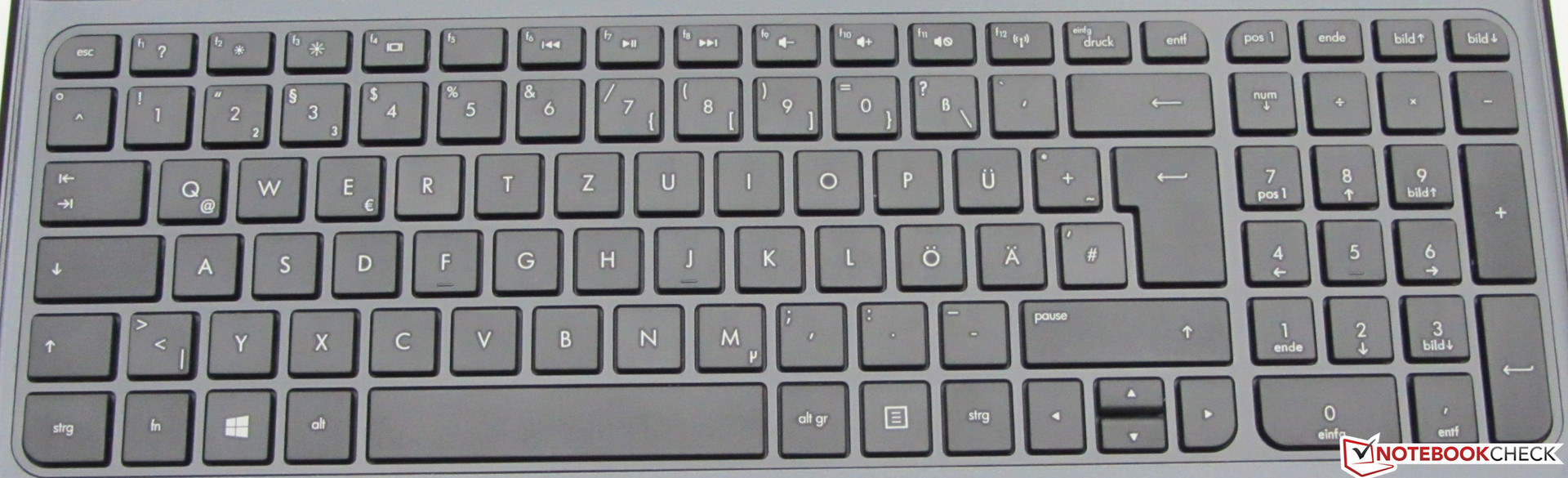 کلیدهای اصلی صفحهکلید Chiclet به ابعاد ۱۵x۱۵ میلیمتر هستند و عمق ضربه متوسط و نقطه فشار واضحی دارند. منطقه بالای درایو DVD هنگام تایپ کمی انعطاف دارد، در حالی که سایر قسمتها تحت فشار زیاد تغییر شکل نمیدهند. یک نقص کوچک در ساخت در جلوی دکمه فاصله (Space Bar) وجود دارد، به طوری که صفحهکلید در این قسمت بهطور کامل با بدنه تراز نیست. به طور کلی، صفحهکلید مناسب است. کلیدهای WiFi، Mute و Caps-Lock هرکدام یک LED کوچک برای نشانگر وضعیت دارند که ویژگی بسیار مفیدی در خرید لپ تاپ است.