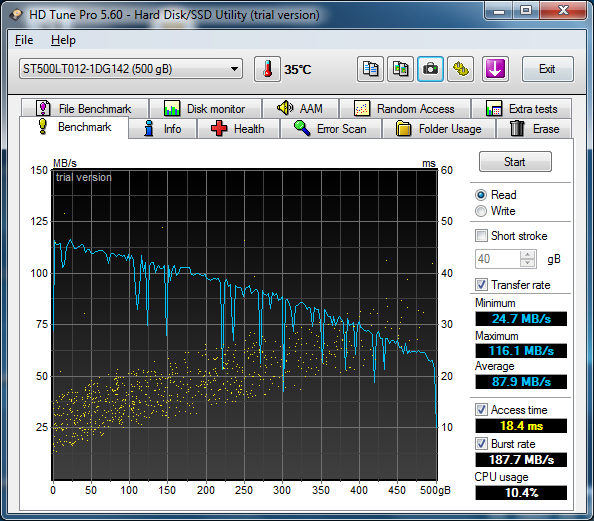 هارددیسک 500 گیگابایتی دستگاه، مدل Seagate Momentus Thin ST500LT012-1DG142 است که ضخامت 7 میلی متر داشته و با سرعت 5400 دور در دقیقه می چرخد. حتی در این محدوده ی قیمتی نیز عملکرد سریع تری امکان پذیر است؛ برای مثال، لپ تاپ Lenovo ThinkPad Edge E5500 از هارددیسک 7200 دور در دقیقه بهره می برد. بااین حال، سرعت انتقال حدود 88 مگابایت بر ثانیه که هارددیسک سیگیت ارائه می دهد، یک مقدار میانگین معقول محسوب می شود. هارددیسک هیتاچی در ThinkPad Edge تنها حدود 10 مگابایت بر ثانیه سریع تر است که احتمالاً بر کاربری عادی تأثیر محسوسی نخواهد داشت. البته هارددیسک های هیبریدی و به ویژه SSD عملکرد بسیار بالاتری ارائه می دهند.