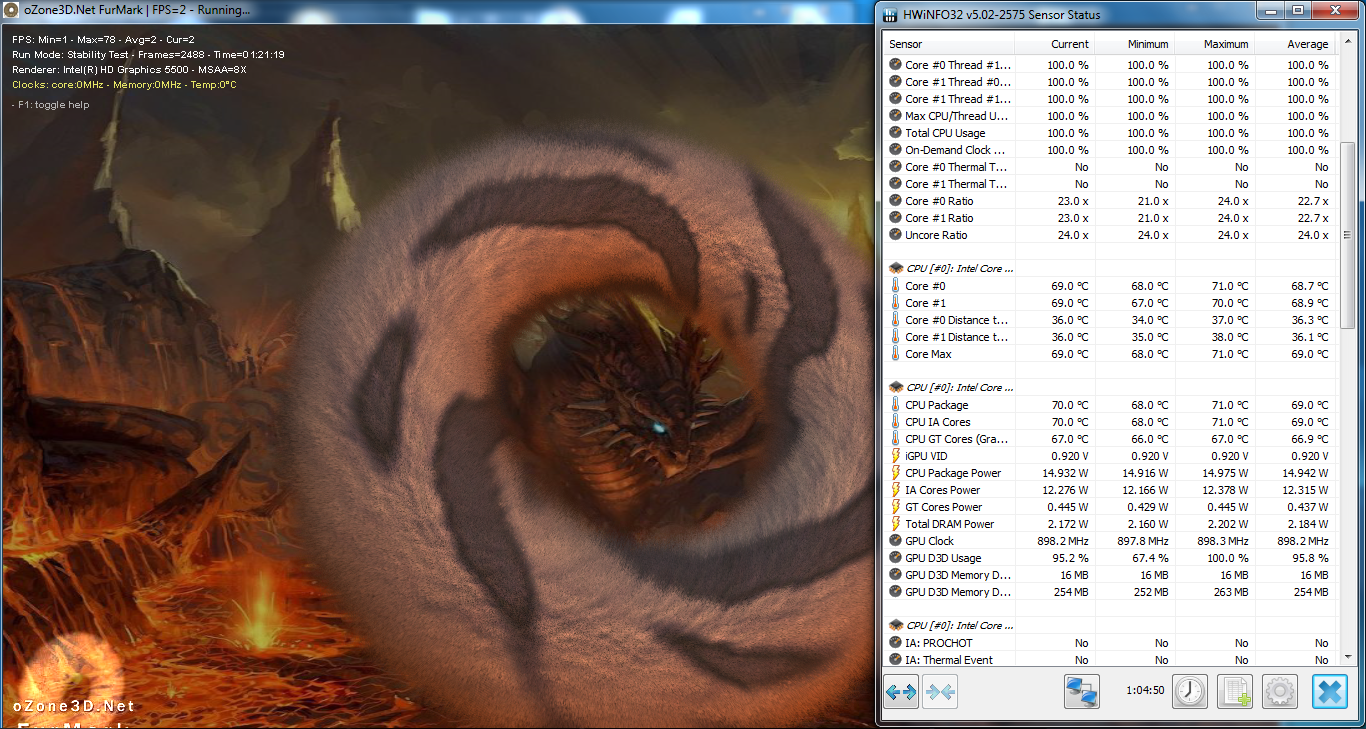 طی تست استرس که دست کم یک ساعت به طول می انجامد، دمای هسته های CPU حداکثر به حدود 70 درجه ی سانتی گراد می رسد که فاصله ی زیادی با محدوده ی بحرانی دارد. در بیشتر این بازه ی تست، هسته های پردازنده در فرکانس پایه فعالیت می کنند.