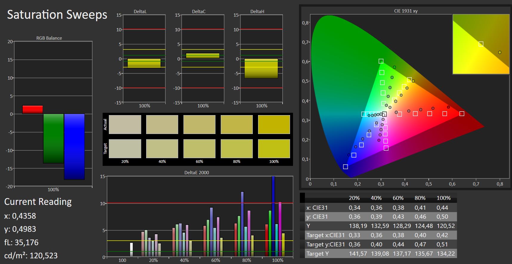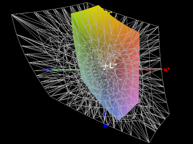 در کاربرد روزمره، محتوای نمایشگر اندکی «گرم» بهنظر میرسد که به حجم رنگ پایین بهخصوص در ناحیهی آبی مربوط میشود. این لپتاپ تنها 38 درصد فضای رنگی AdobeRGB و 58 درصد فضای sRGB را پوشش میدهد که در محدودهی معمول لپتاپهای این ردهی قیمتی است.